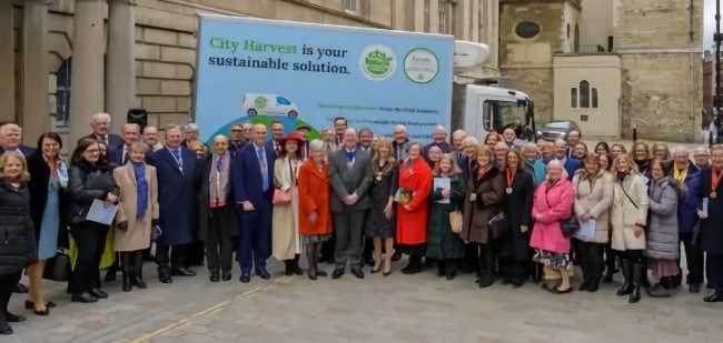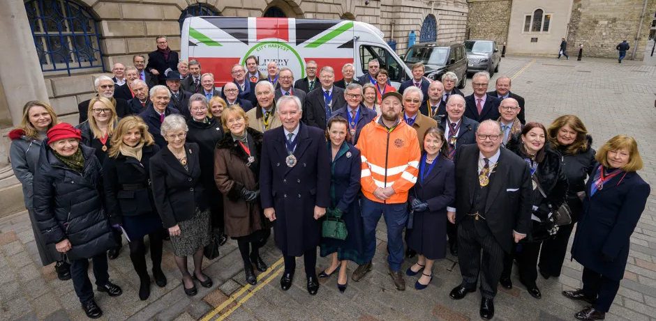6 March 2024, The Lord Mayor, Alderman Professor Michael Mainelli (centre) launches the pan livery, Livery Food Initiative truck for City Harvest in front of Mansion House, Walbrook